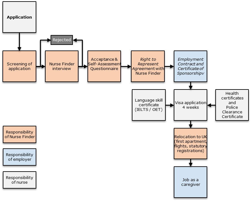 Nurse Finder interviews all nursing candidates to evaluate their English language skills, motivation to work as a caregiver and motivation to relocate to the UK. After the Nurse Finder Interview, the nurse receives a link to the Nurse Finder’s Self-Assessment Questionnaire, and the nurse shall sign the Nurse Finder’s “Right to Represent Agreement” that specifies the rights and obligations of both parties in the process.